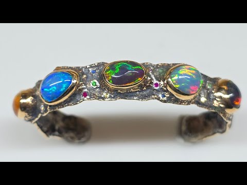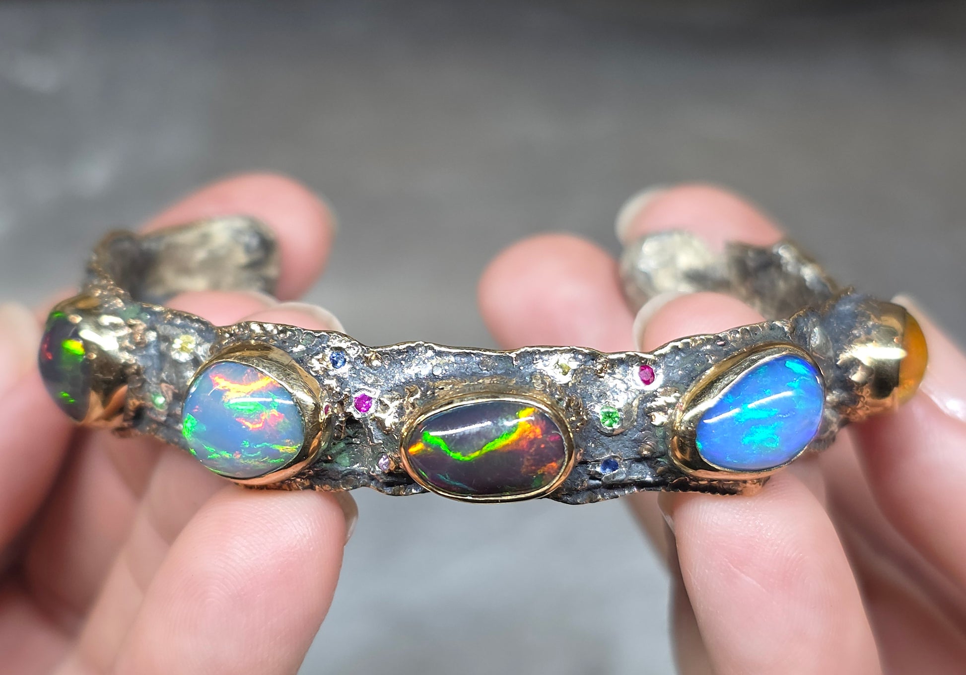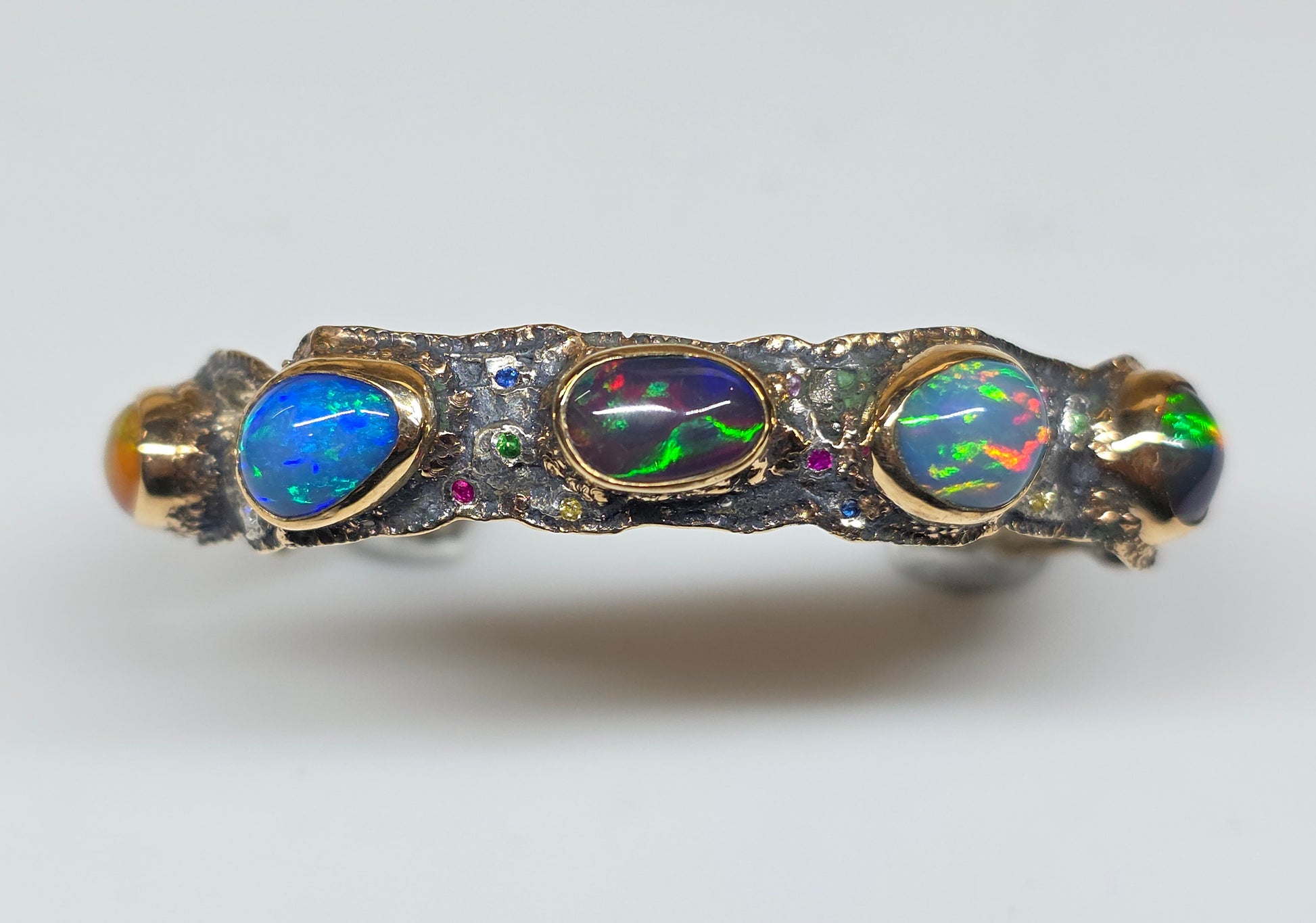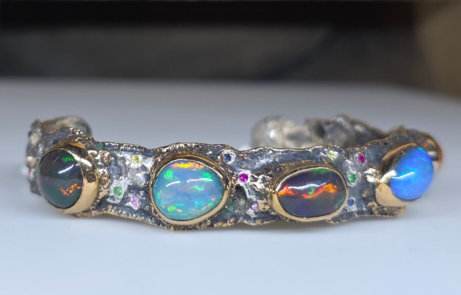 A Sterling Silver cuff bracelet set with 5 colorful opals, and a collection of various accent stones: ruby, sapphire, and green tsavorite garnet. Gold fill bezels the 5 opals and also lines the outer rims of the bracelet. Take a look at the item video for a closer look.