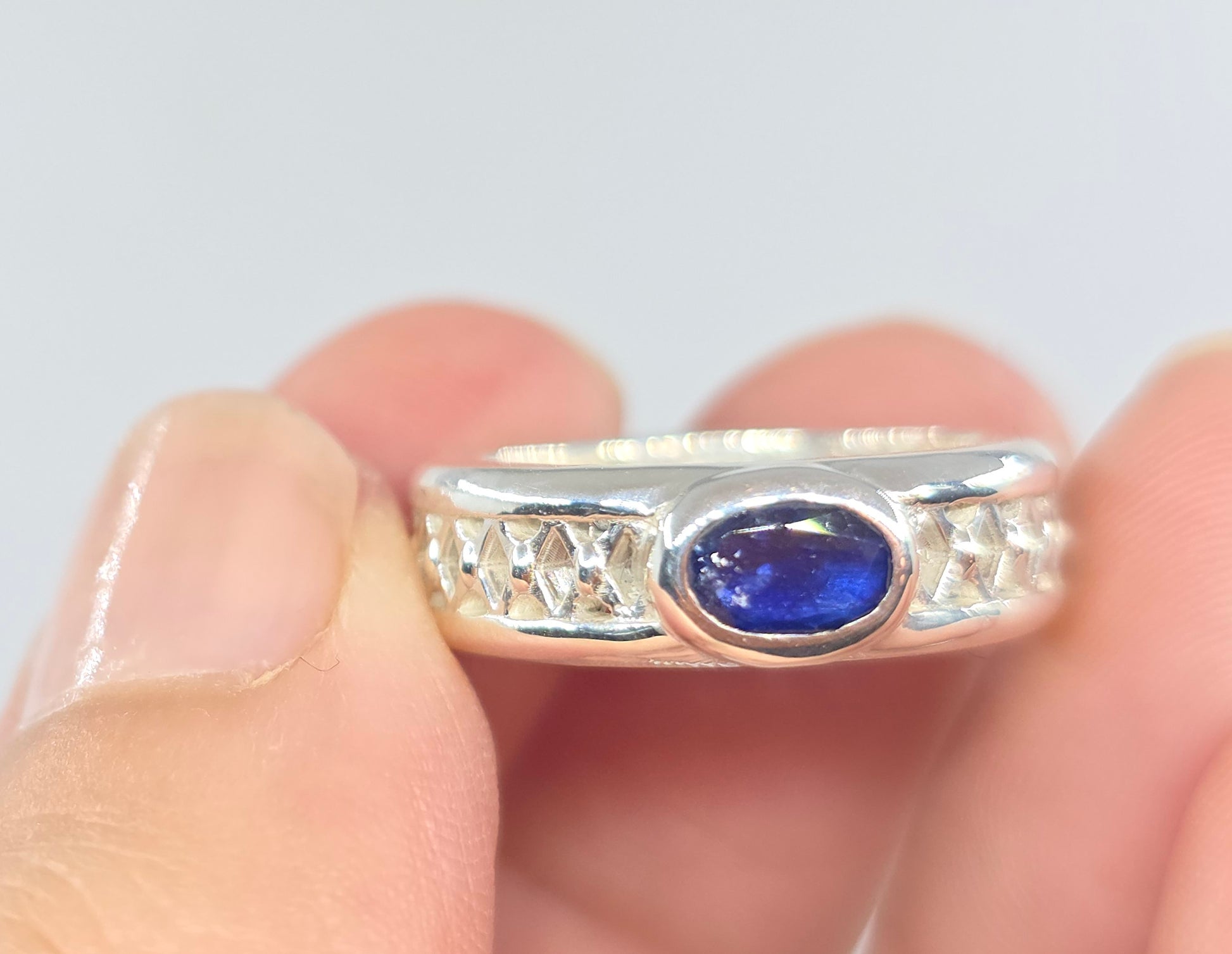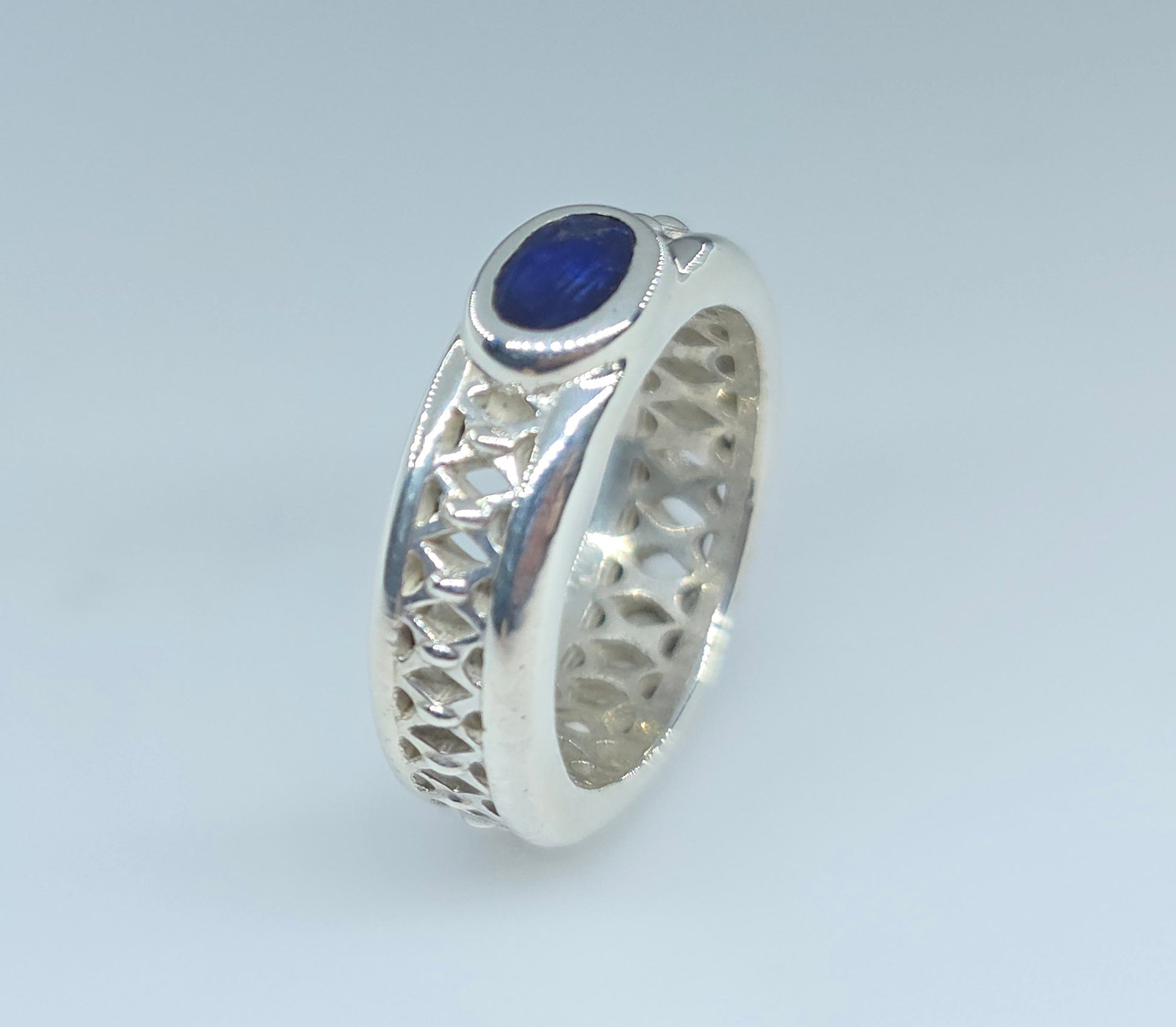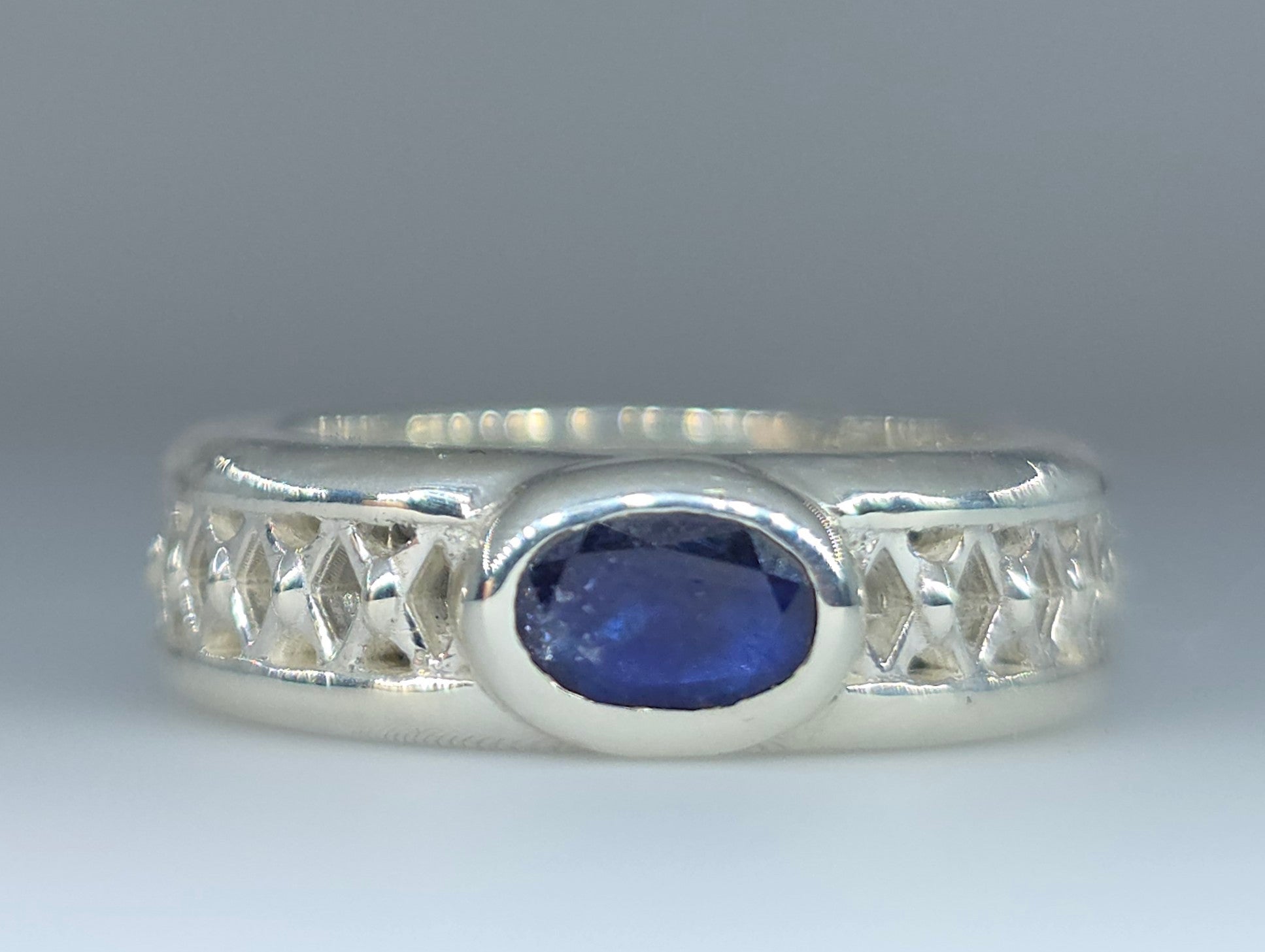 A sterling silver ring with blue sapphire gemstone.