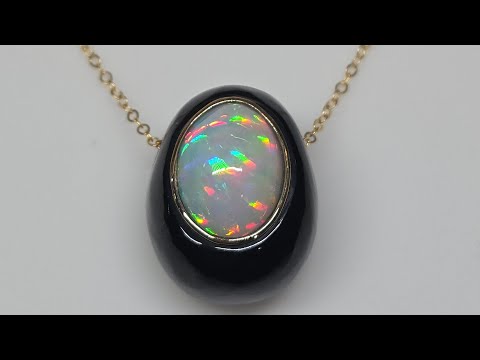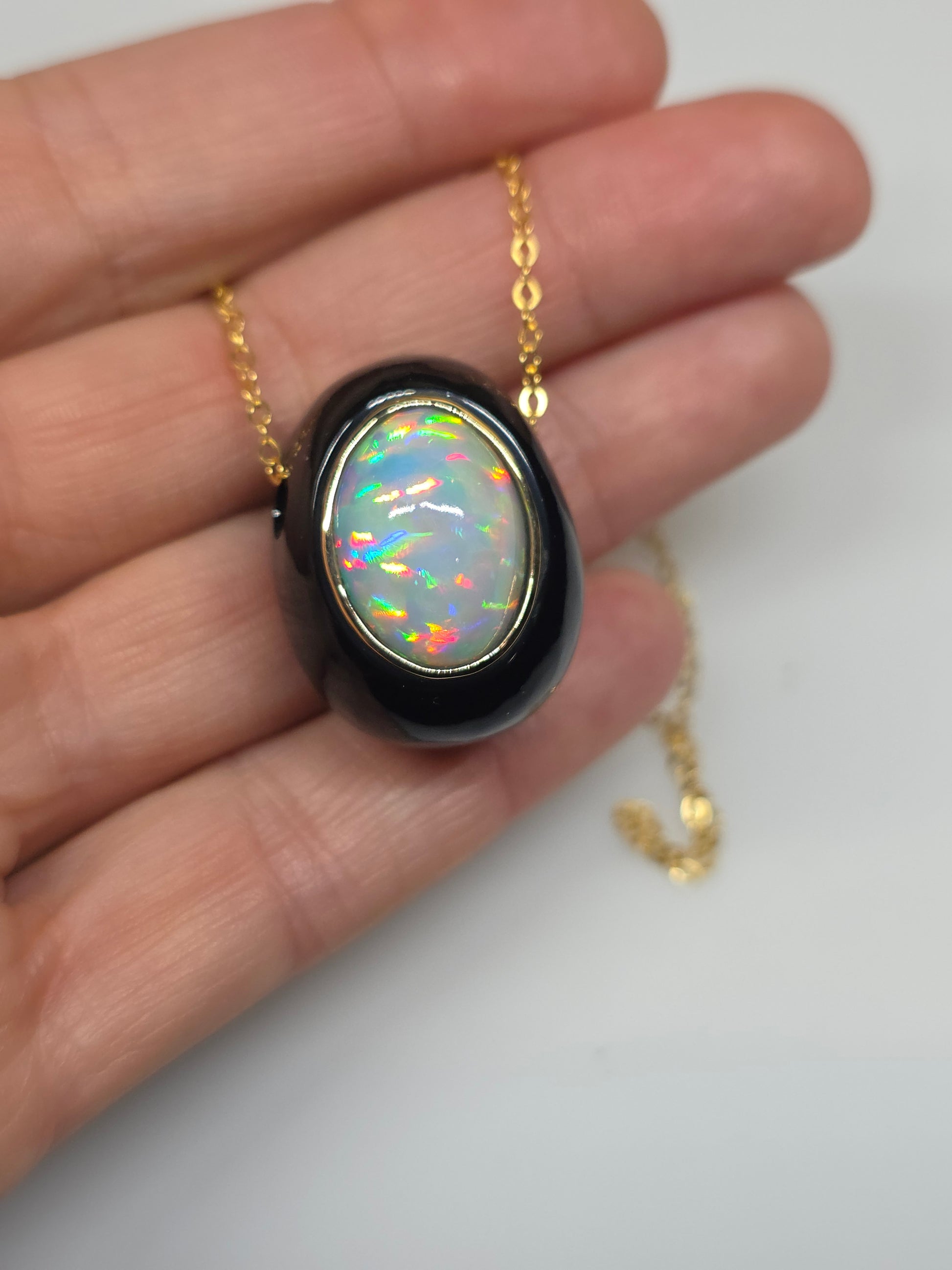 A colorful white opal with red and green fire colors, set into black onyx with 14k gold bezel.