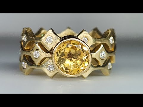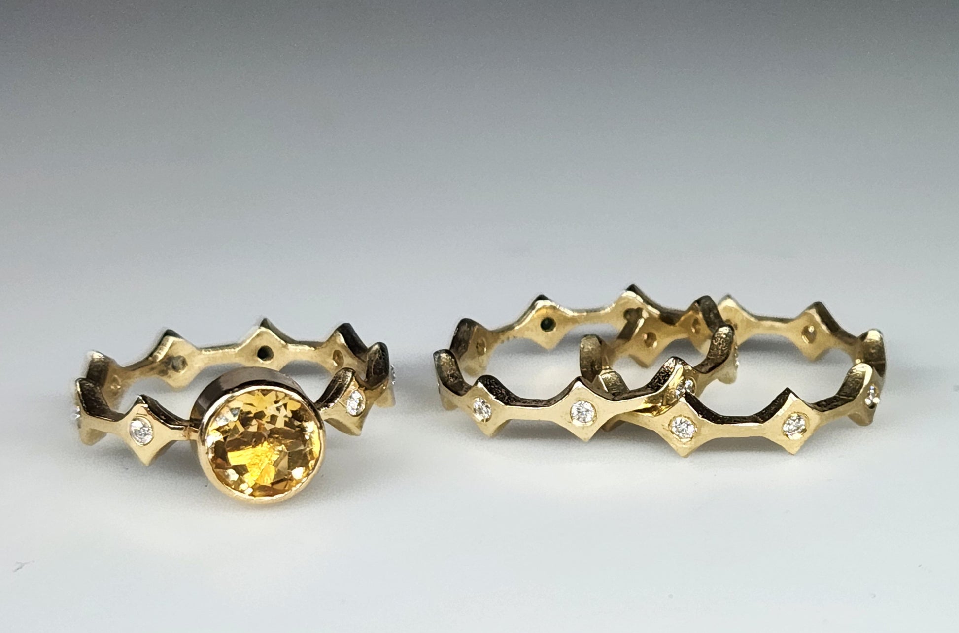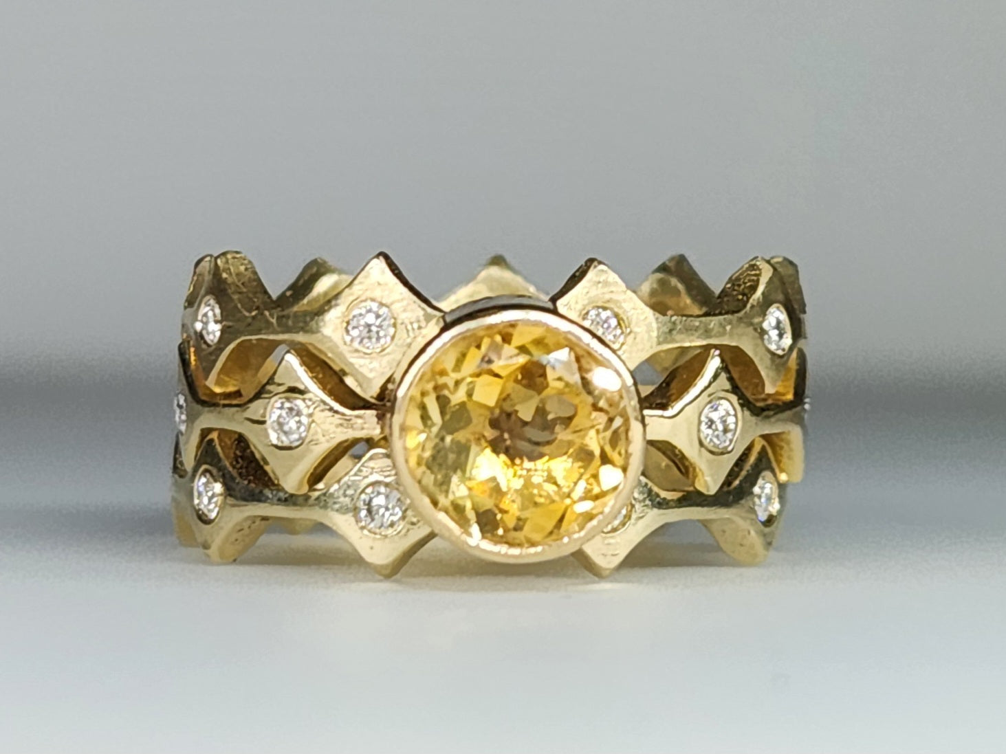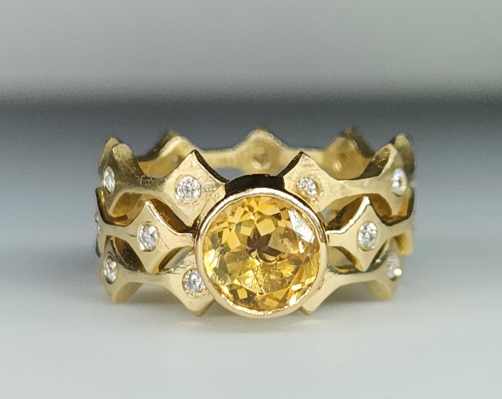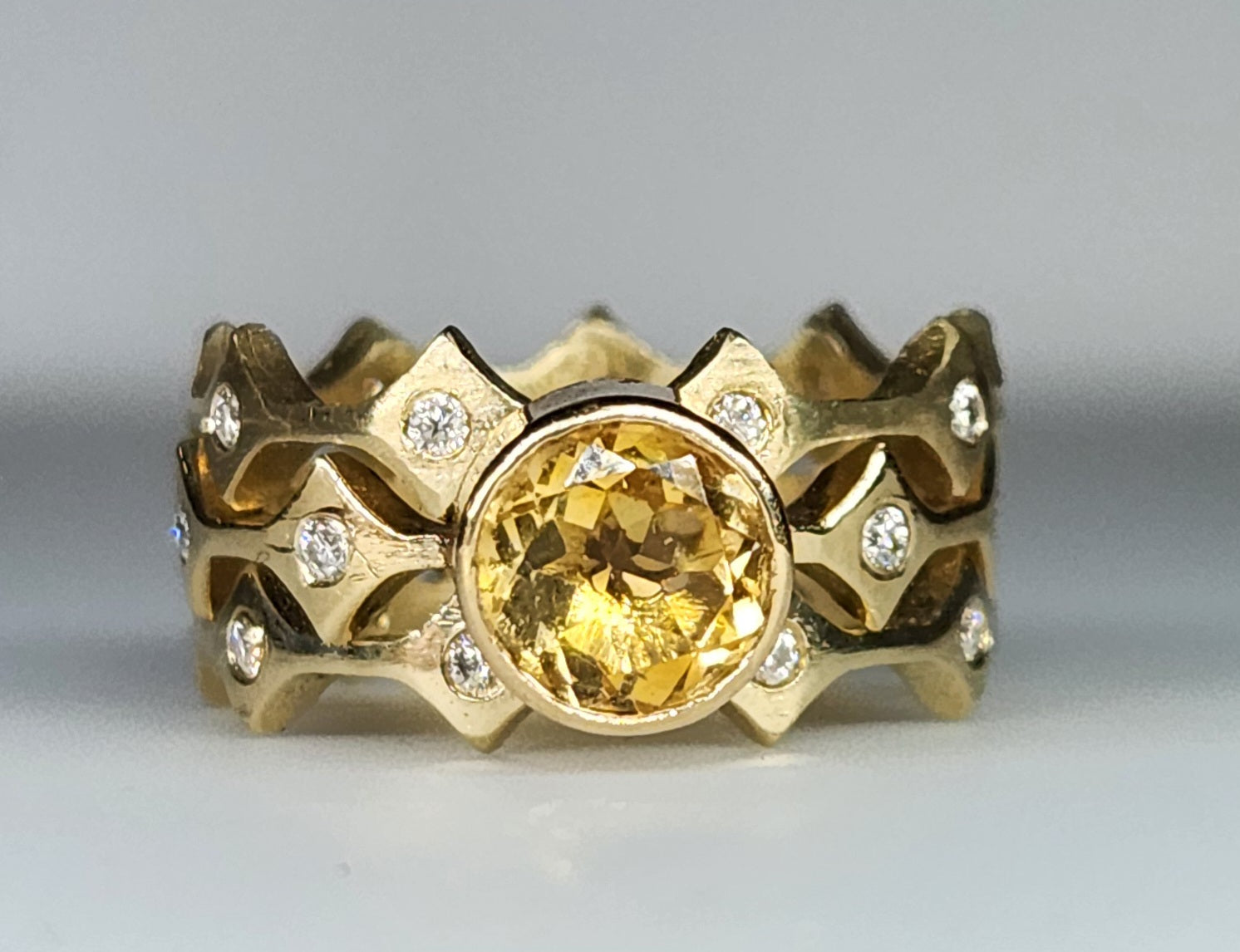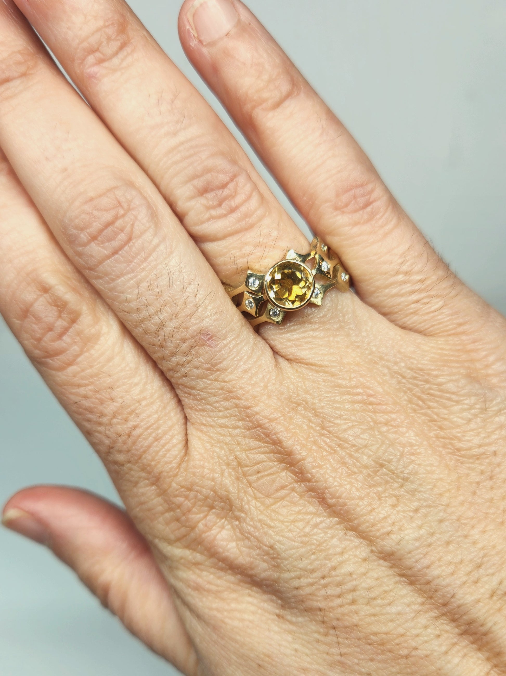 A bright yellow citrine set in a 14k solid gold band, with moissanite accent stones. Two solid gold stacking bands are available to add to this ring (see available options)